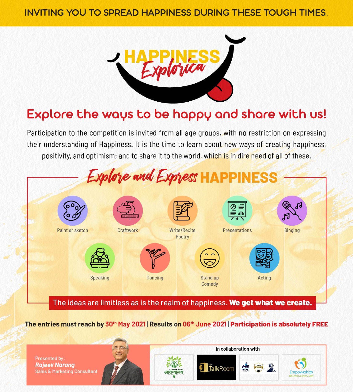 Participation is invited from all age groups, with no restriction on expressing their understanding of Happiness. The participants can showcase their expression in any form, whether a painting or by reciting a poem or making a video